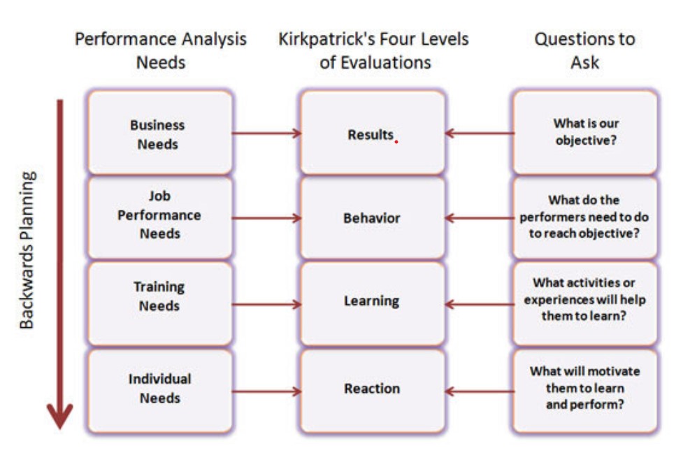 The key to using the model effectively, is to make training evaluation an integral part of your training design from the beginning. By working backward on the Kirkpatrick 4 levels, you can develop training initiatives that are effective and impactful—and directly tied to measurable outcomes. Adapted from Kirkpatrick (2021).